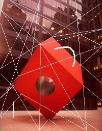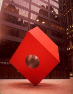 I've tried turning my back to the cube, but it is too precariously balanced. Good thing it floats. When it falls, perhaps whatever levitates it will also cushion its fall? I hope Noguchi thought of that. It can't possibly stay that way forever. The minute I'm not watching I know it will fall over and all those extended radial lines, the corner 'poles', will collapse with it, like a Bucky Fuller vortex suddenly crashing to the ground, striking the pavement with great clanging sounds as clowns pour out of the surrounding buildings tossing hoops and day-glow triangles into the air, making crazy shapes fly about in a carnival of four dimensions. For now, its all corners and it makes me dizzy. If only it would lie down like a well-behaved box, then I could fold up the ends like a cardboard carton, crawl inside and listen to the snarl of tilted worlds going on around me. Maybe then, I could stop watching it. Perhaps someone will hand me a sandwich through the hole once in awhile.