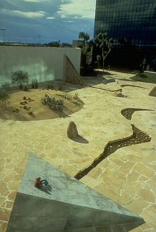 It's a pile of rock, a mound 12-feet high, 15-stones fitted so, placed just so, sure but why? &why 'The Spirit of the Lima Bean'? raised above the long illusions of plateau and meandering canal on a tessellated floor. Dry sandstone recalls the sweeping vistas once proud Californios must have known at least as well as their horses knew the contours of the valley lands by the grass winds and pollen blown, by salt-scented loam and sea spray tossed in the off-shore breeze. It was one of the brightest spots to be found in all our bright land John Muir said of that still most wilderness, the smooth brown bosom of the Valley, is what he said he found. Here and there, along with their conceits, he saw little towns baked in tired argument their petty differences, white and brown where shingle and adobe met and priest and pioneer had once contended. While all else slept, then and now would draw the same breath from the same mountain air. He looked at the sky, he said, and to the garden lands as well. The rest was just a checkerboard affair— scant preview, things to come whence idyll ends and soon enough the new barbarity begins. That is what he said he found, and we'll take him at his word. So much blood was shed by then. It was 1877 and there was little left of those affairs, little point to wonder why no thatch or long-pole settlement remained. No hovel, no adobe, nor the grog shops of San Gabriel or pueblito sinkholes troubled that landscape with their abject cries to the gardens of the sky. The Chumash, Serrano, Gabrieleno are not even mentioned in his catalog of semi-barbarous civility—They do not appear at all, stewards from another time another year among the brightest of places he'd embrace for its exuberant wholeness. By then they had all but disappeared, all hundred and thirty-thousand of them, all but a handful that stooped here and there to pick a little cotton, corn or bean or an orange, sweet-bitter orange that blessed his bright wilderness, Oh Wilderness, swept clean. Now the office workers file by seen through curious garden eye, homage to the spirit of the lowly bean. Nothing in the plaza stands still where the shadow of the passerby makes its escape by some slant geometry beyond the walls, the hills, the valley. For, say the spirit will not rest there in the noonday still. It will not stay there among those who come and go along the way. Do they ever stop to ask themselves, why? "Milk and honey, and plenty of money," Dr. Conger said to Muir. Among the olive, walnut, lemon and orange— or the banana with its dark comb leaf— but above all, the orange. Sweet and lucrative the night air becomes to those who can afford to wait, and corn. But not a whisper of the little bean, torn just so, from some unknown and more bitter, transitory plate. There was once a wilderness here, too. Once, here beneath these shimmering glass falls all sky was open to view with little need for walls' disguise, the lima left to fable on the tables of Peru. Enough to gather and hunt, some pretty damn big canoes and plenty shell-bead to go around. Don't kid yourself, long before, Alta California commerce was a lively game in town and down around the Santa Anna river, the boys would whoop it up and bury their dead beneath the ground. They are not fit like the ancient concourse stones that abut a perfect surface on the slopes of terraced Inca farms. Rather segmented, open and articulate as though, a moment more, leaf will open above the semi-arid plain, root will show and bur into the vastness of this California Scenario. Beans grow and yes, plenty of money flows.